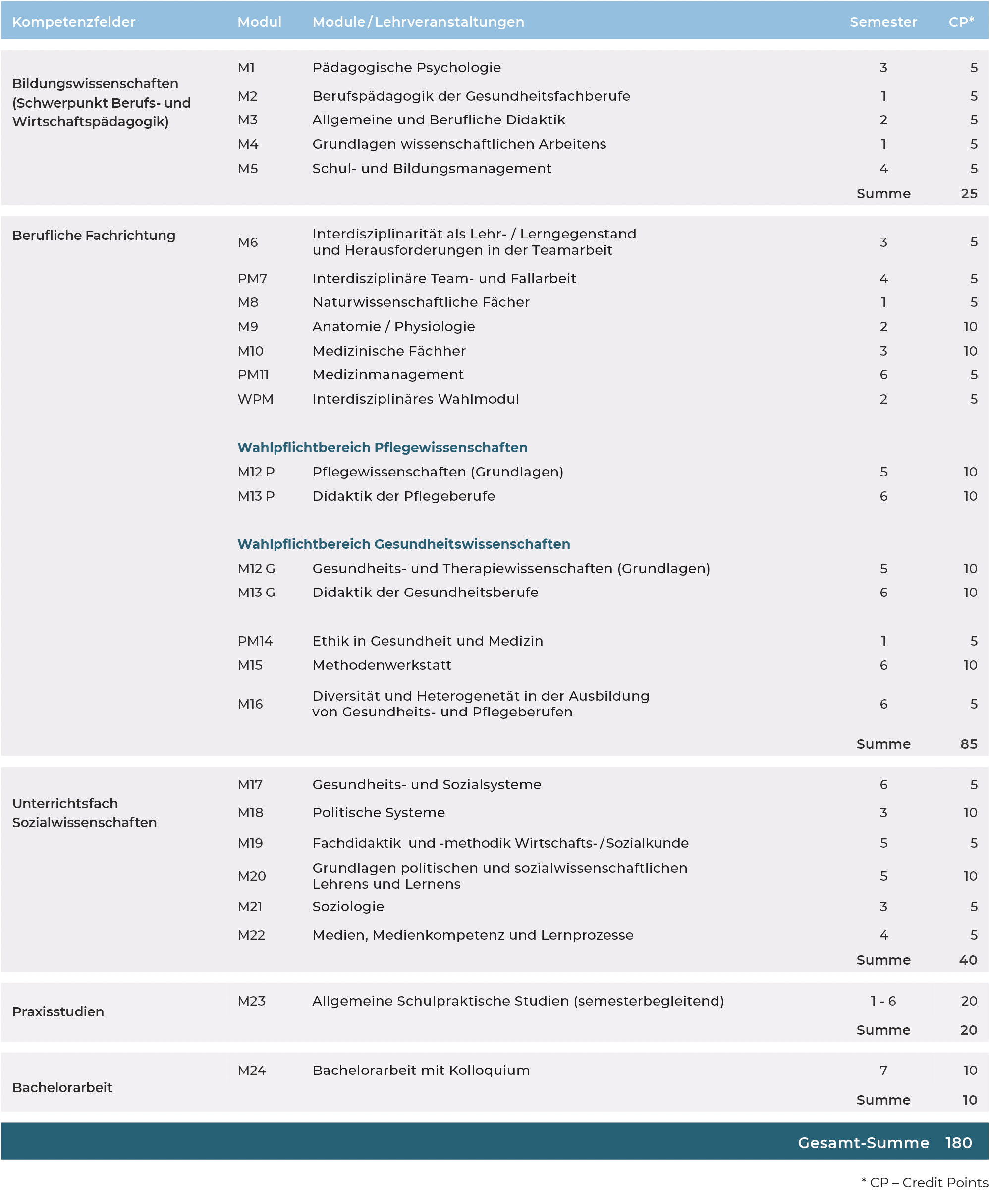 Mit dem Bachelorabschluss in Medizinpädagogik qualifizieren Sie sich für die Praxislehre an nicht öffentlichen Schulen des Gesundheitswesens sowie für die praktische Anleitung in der Ausbildung von Gesundheitsberufen. Je nach länderspezifischen Vorgaben können Sie auch den Theorieunterricht an Schulen des Gesundheitswesens übernehmen. Dabei bietet Ihnen unser flexibles Teilzeitmodell mit einem Mix aus Präsenzlehre (vier Tage pro Blockwochenende) und virtueller, ortsunabhängiger Lehre die Chance, Ihren Beruf weiter fortzuführen. Die Monate März, August und September sind vorlesungsfrei.