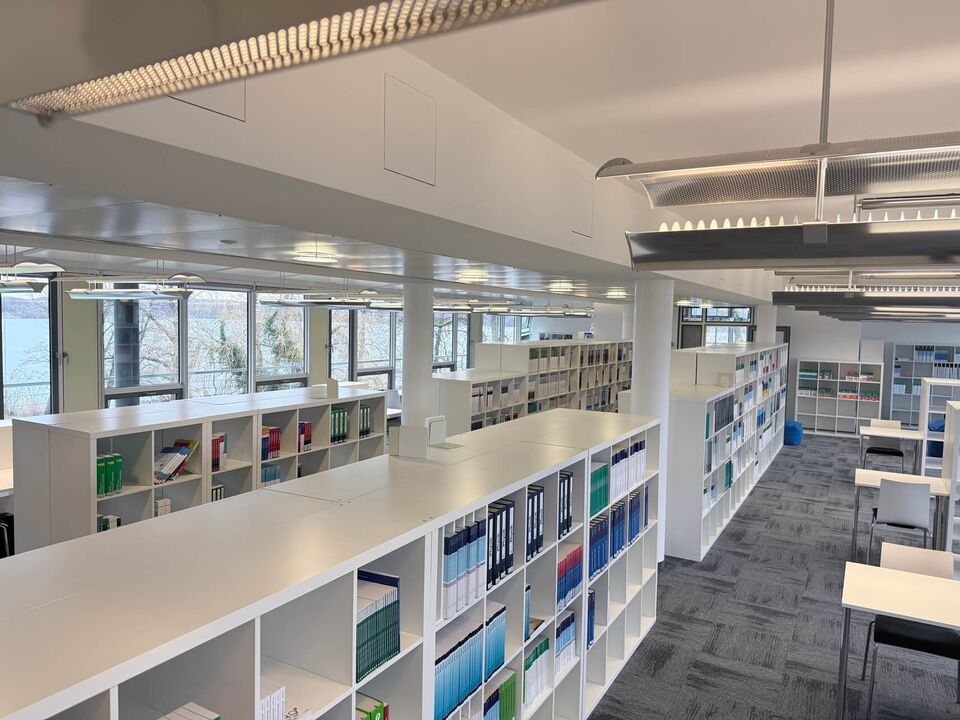 Neuer Campus, neue Bibliothek: Die HMU wächst weiter und nach dem Einzug in die neuen Räumlichkeiten am Luftschiffhafen steht den Studierenden dort ab sofort auch eine eigene Präsenzbibliothek zur Verfügung – mit Blick auf den Templiner See.